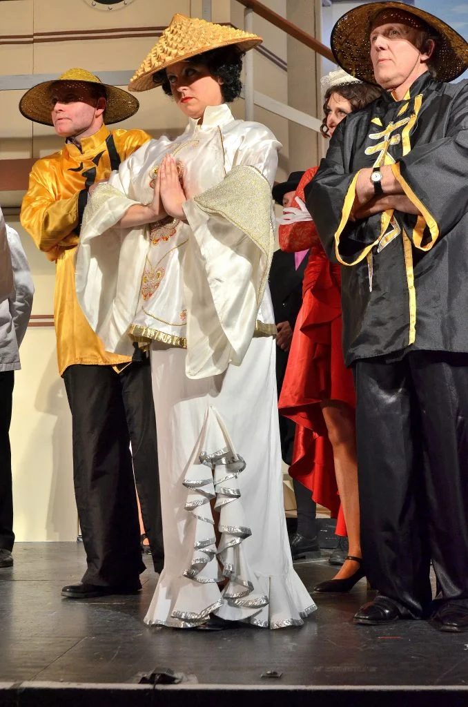 In his welcoming letter in the nicely-produced programme, Alan Collins, Chairman of SWMTC, invited us to climb abroad the SS American and join the crew and passengers on the ship's voyage from New York to England in this satirical nonsense musical, Cole Porter's "Anything Goes". Thus, we were treated to a stage converted to the very realistic afterdeck of an ocean liner, complete with moveable stairways, upper deck and state room cabin, all designed, engineered and painted in-house by the company's talented set design team.
